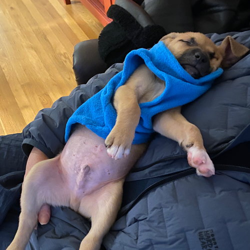 Otis and Tricia were found with 6 other puppies on a Georgia Highway, abandoned. They were taken to a shelter and our COO took the youngster under her wing. Names are Otis and Tricia and breed is — dog. Super active and fun, seems like they are all on or off.